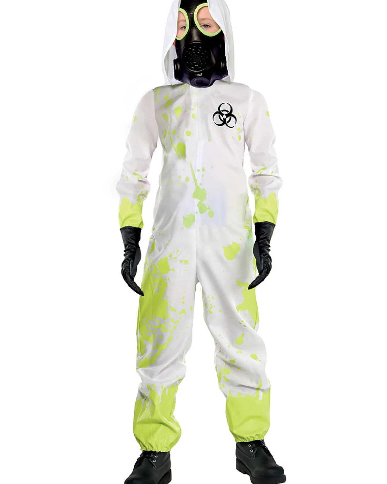 Keep Yourself Covered In This White Hazmat Suit Boys Costume. The Costume Features A White Hooded Jumpsuit With Printed Splatters Of Bright Green Splatter And A Black Printed Image Of A Radioactive Symbol On The Top Left. There Is A Black Foam Gas Mask Style Half Mask And A Pair Of Black Gloves. Keep A Lookout For Trouble This Halloween.