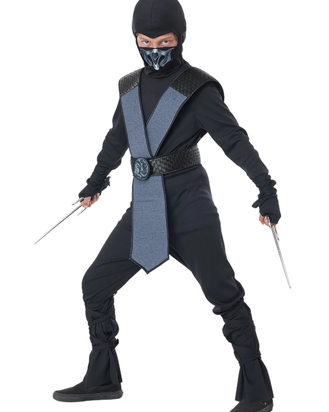 Master The Way Of The Dragon Wearing Our Dragon Master Blue Ninja Boys Costume. The Costume Features A Black Shirt With A Hood, An Attached Balaclava-Styled Mask With A Dragon Illustration, Black Pants And A Brown Leather-Like Belt With A Yellow Tabard And Dragon Medallion. The Costume Comes Complete With 2 Black Arm Wraps And 2 Black Leg Wraps.