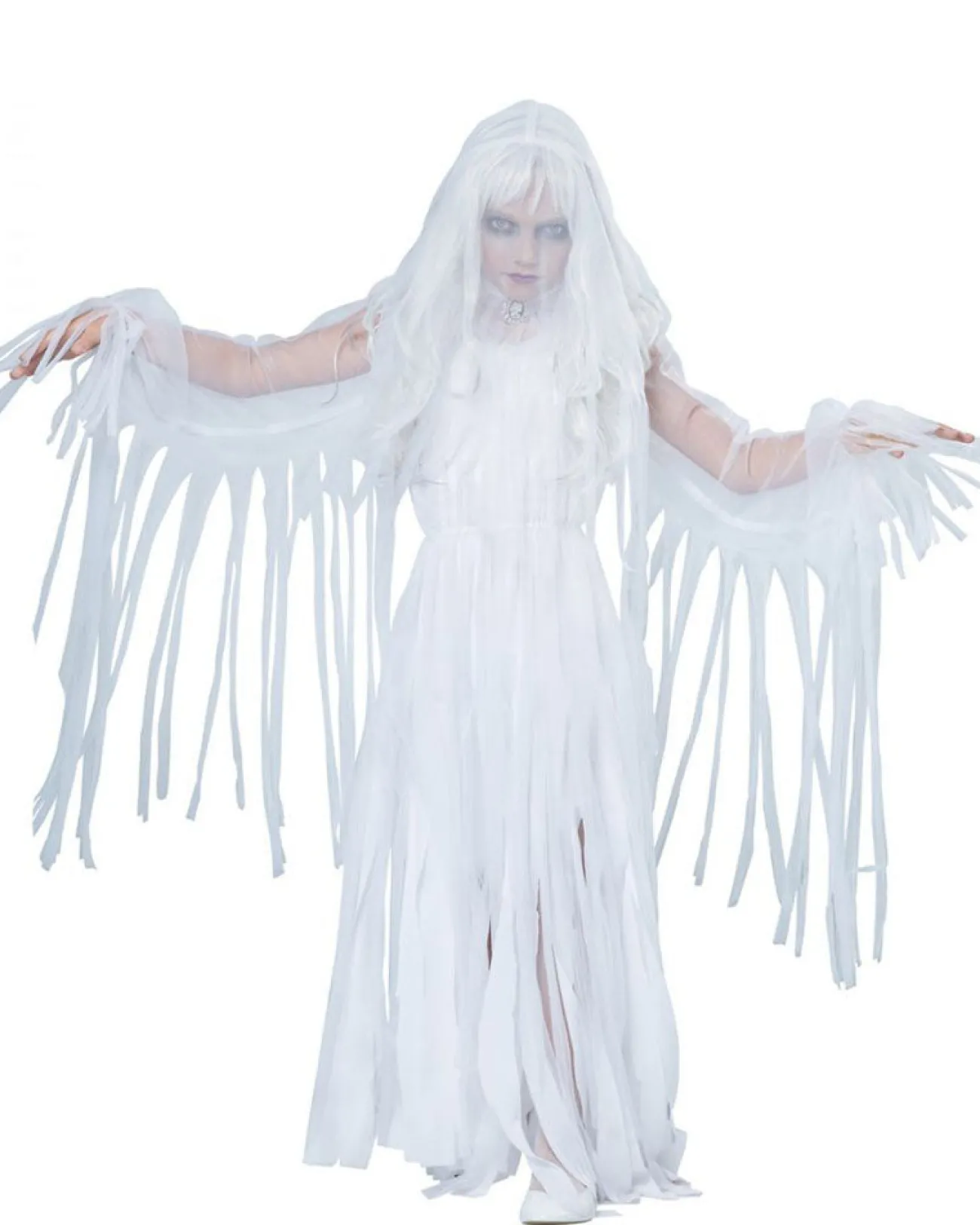 Your Girl Will Look Haunting This Halloween In The Eerie Ghostly Girls Costume. This Costume Comes With A White Mesh Overdress With Flowing Fabric Strip Sleeves And A Detachable Hood, A White Under Dress And A Brooch To Complete The Look.