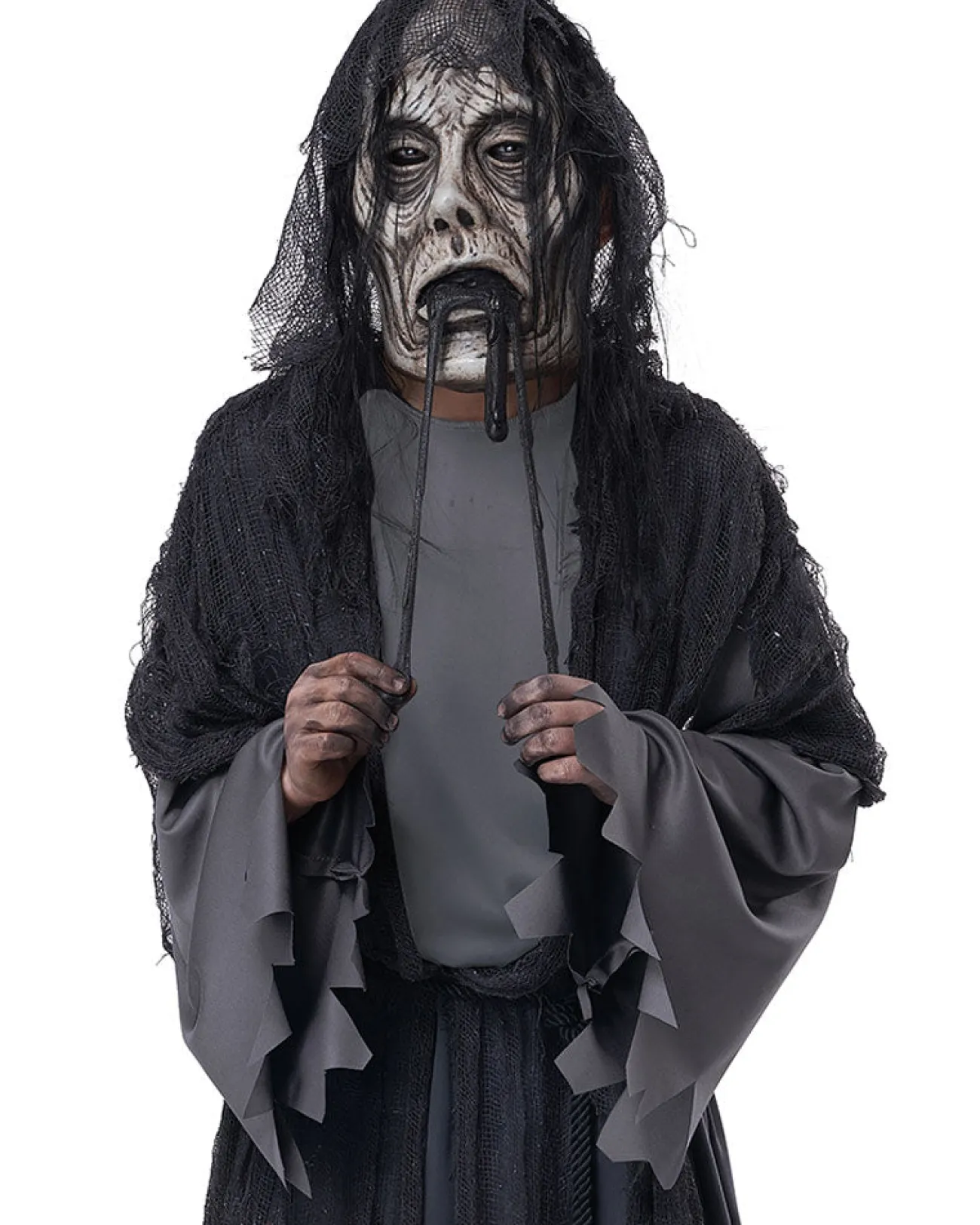 Haunt The Cemetery In This Ghoul In The Graveyard Boys Costume. The Costume Features A Grey Robe With Jaggered Hem And Cuffs As Well As Dark Grey Mesh Over Drape With Attached Hood. Also Included Is A Cord Waist Tie And A Flexi-Lite Mask With Attached Wig Strands. The Mask Features A Terrifying Face With One Sticky Stretch Slime Piece That Can Be Attached.