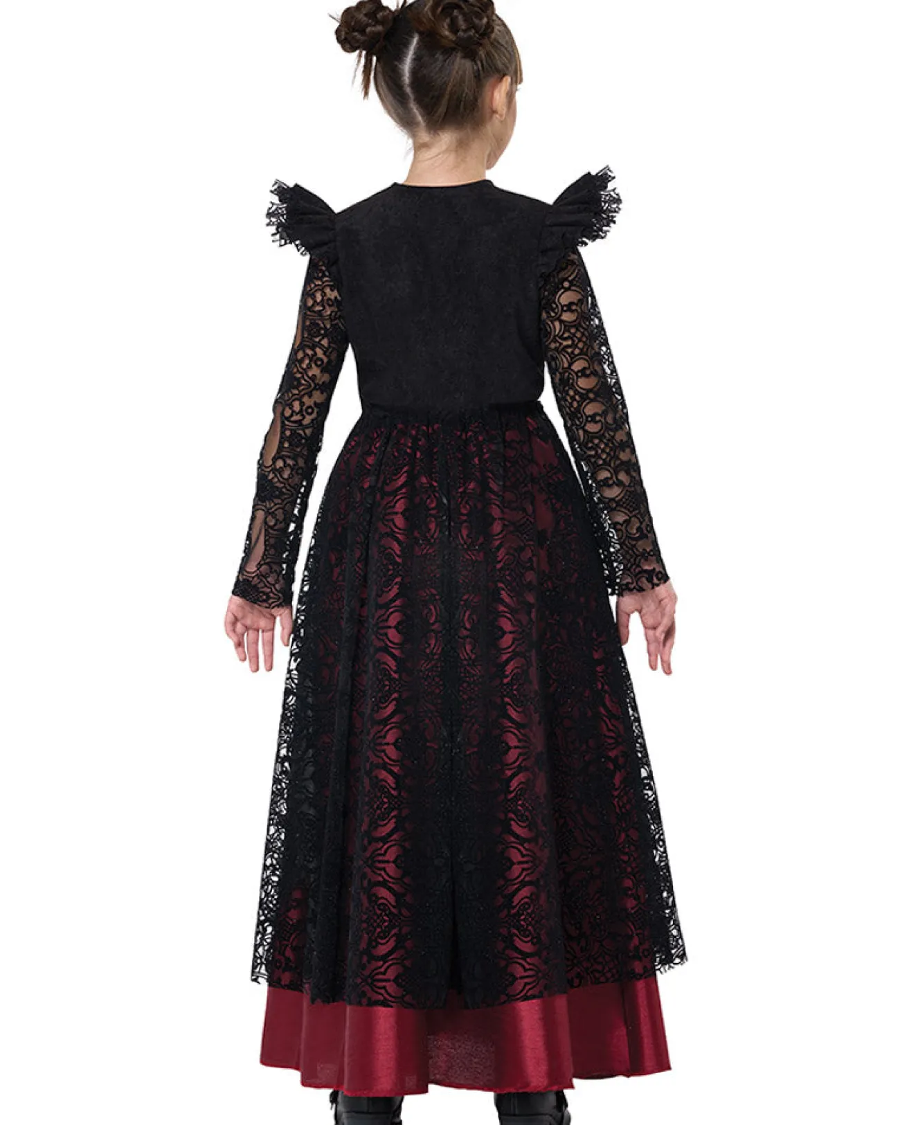 Embrace The Allure Of Darkness And Step Into The Gothic Lace Vampire Deluxe Girls Costume. This Captivating Ensemble Is Designed For Girls Who Are Drawn To The Mysterious World Of Vampires And Crave An Enchanting And Elegant Look. The Costume Comes With A Hauntingly Beautiful Deep Red, Sateen Sleeveless Dress, Exuding An Aura Of Seductive Elegance. Adorning The Dress Is A Breathtaking Black Lace Peplum Overlay, Featuring Frilled Shoulders And Long Sleeves That Cascade Down With An Air Of Enchantment. The Lace-Up Bodice Adds A Touch Of Gothic Glamour, Allowing For A Customised And Bewitching Fit. With Every Step, You’Ll Captivate All Who Cross Your Path, Exuding An Irresistible Blend Of Beauty And Darkness. Unleash Your Inner Vampire Princess This Halloween And Become A Mesmerising Creature Of The Night.