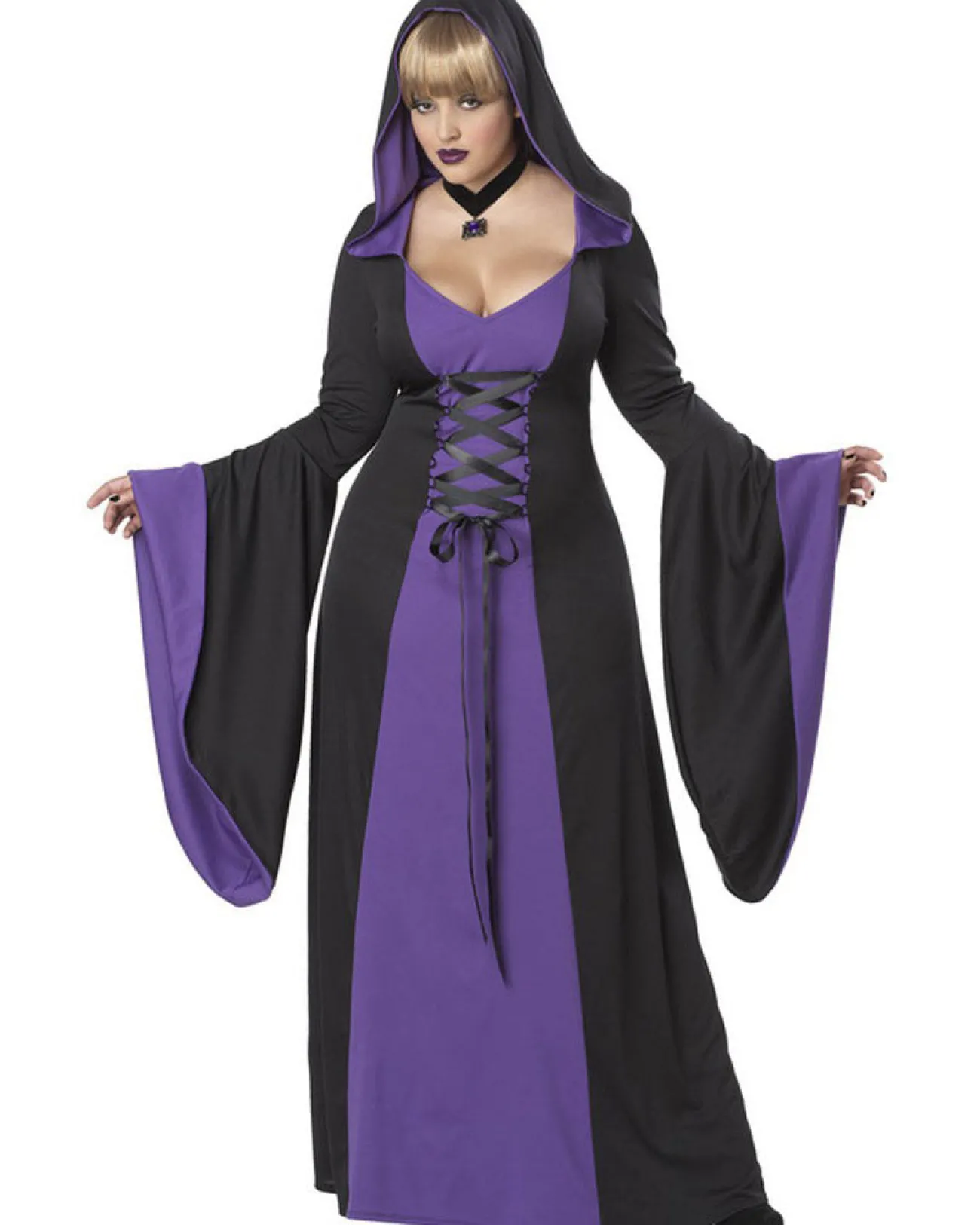 This Hooded Robe Womens Plus Size Costume Is Perfect For Halloween Or Spooky Themed Party. The Dress Includes A Black And Purple Bell-Sleeved Robe With An Attached Hood And Lace Up Bodice. Perfect For Any Body Shape.