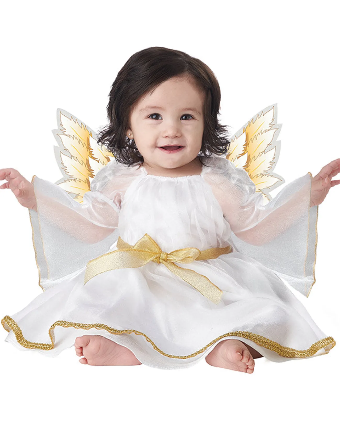 Your Little One Would Love Our My Little Angel Infant Girls Costume. The Costume Features An Angelic White Costume Including A White Dress With A Gold Hem, Attached Satin Gold Ribbon With A Bowtie, Transparent Bell Sleeves And Attached Gold And White Wings.