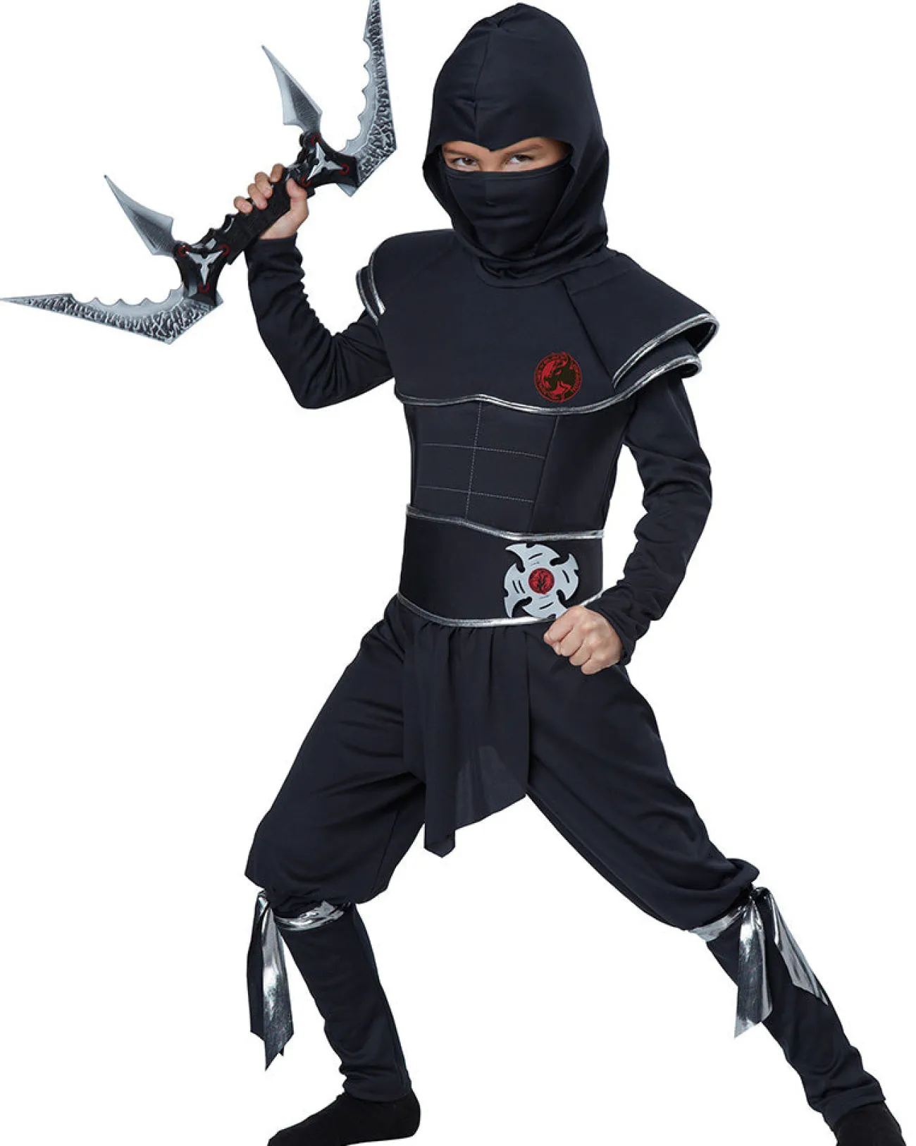Get Ready For Action With This Ninja Warrior Boys Costume. This Costume Comes With A Black Jumpsuit That Fastens With Velcro At The Center Back And An Attached Black Hood With Silver Trim Collar And A Red Dragon Emblem. A Matching Black Belt With Tabard Which Fastens At The Back With Velcro, Black Face Mask With Ties And A Silver Foam Ninja Star Is Also Included To Complete The Look.