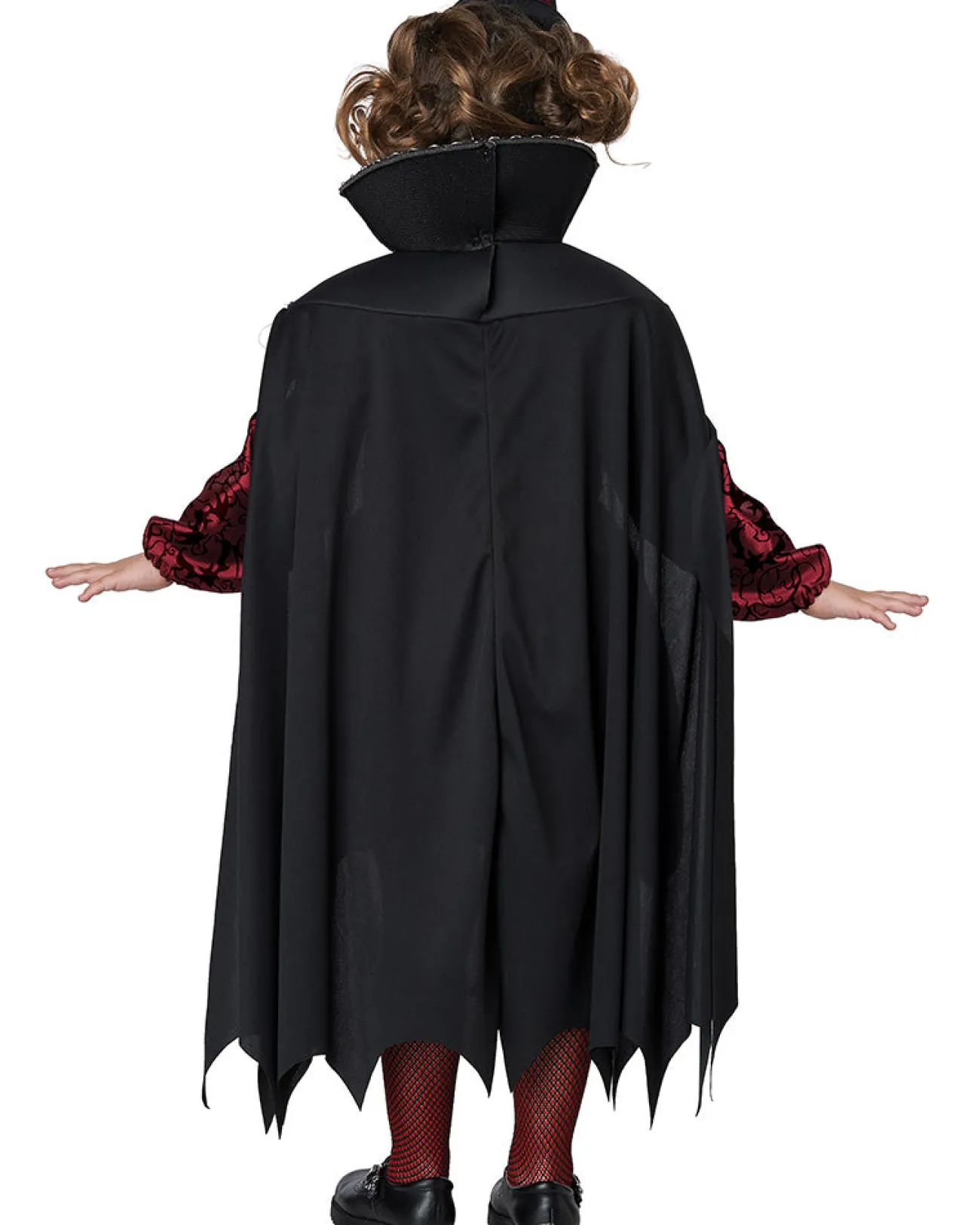 Watch Your Little Girl Prowl The Streets For Her Next Snack In This Posh Vampire Toddler Girls Costume. This Gothic Costume Comes With A Red Metallic Dress Printed With Black Detailing And Scalloped Gold Trim, A Black Cape With An Attached Collar With Gold Trim, Both With A Scalloped Hem. For A Victorian Touch Is An Included Gold Brooch With A Red Gem In The Centre In Pin Onto The Collar And A Mini Black Top Hat With A Red Ribbon Around The Base. Pair This Costume With Our Range Of Vampire Accessories For Kids.