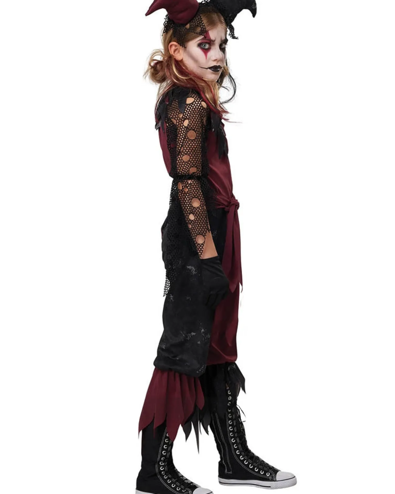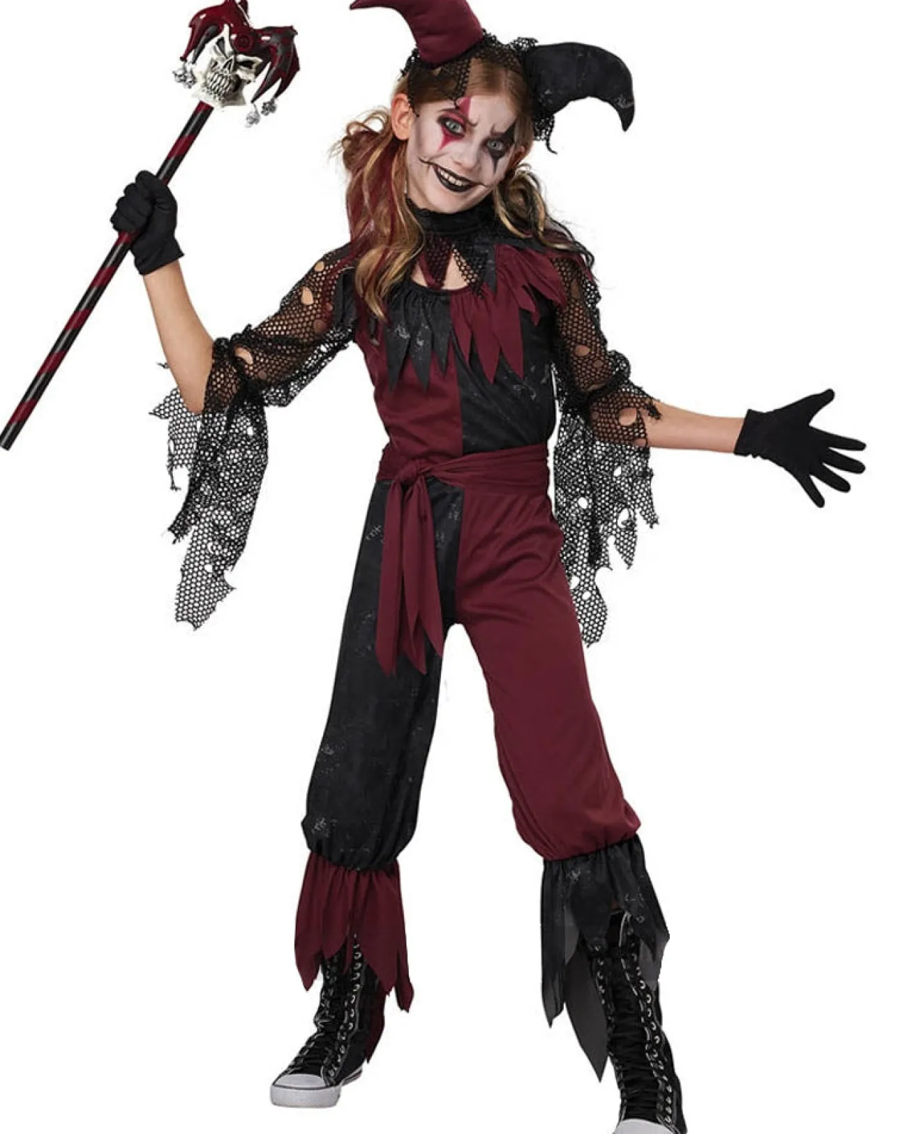 This Psycho Jester Girls Costume Is Perfect For Halloween To Give Your Friends A Big Scare. The Costume Comes With A Two-Tone Long-Sleeved Top In Black And Red With A Tattered Neckline And Tattered Black Mesh Sleeves, A Matching Pair Of Black And Red Two-Tone Pants With An Elastic Waist And Tattered Cuffs And A Red Fabric Waist Tie. Also Included To Complete This Creepy Jester Costume Is A Tattered Black, Red And Mesh Collar And A Headpiece With Matching Black And Red Horns On A Headband That Look Like The Spokes On A Jester’s Hat. Pair With Gloves, Shoes And Some Terrifying Makeup For The Ultimate Halloween Costume.