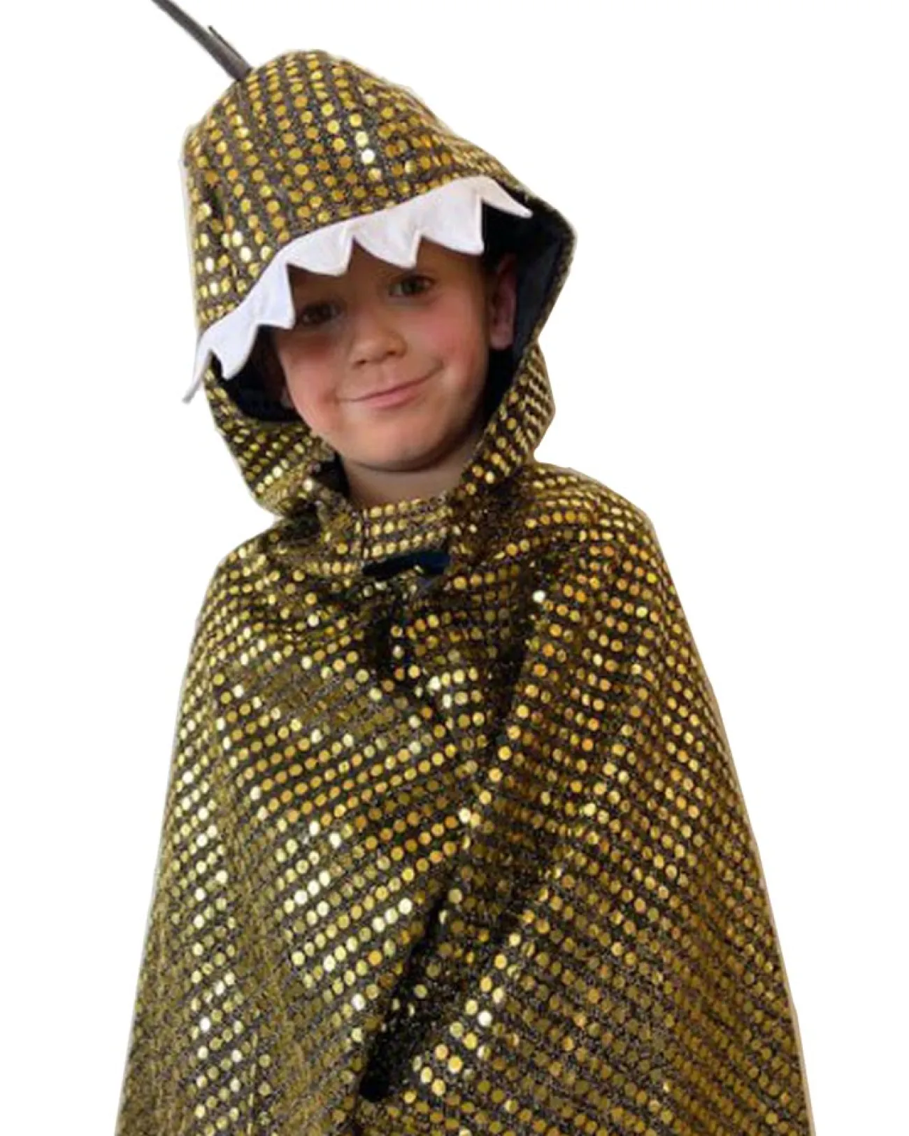 Your Little One Would Appreciate Our Golden Dragon Cape. Featuring A Dragon Cape With Gold Sequin, An Attached Hood With White Teeth, Black Horns, A Sawtooth Hem With A Piercing Pair Of Red Eyes.