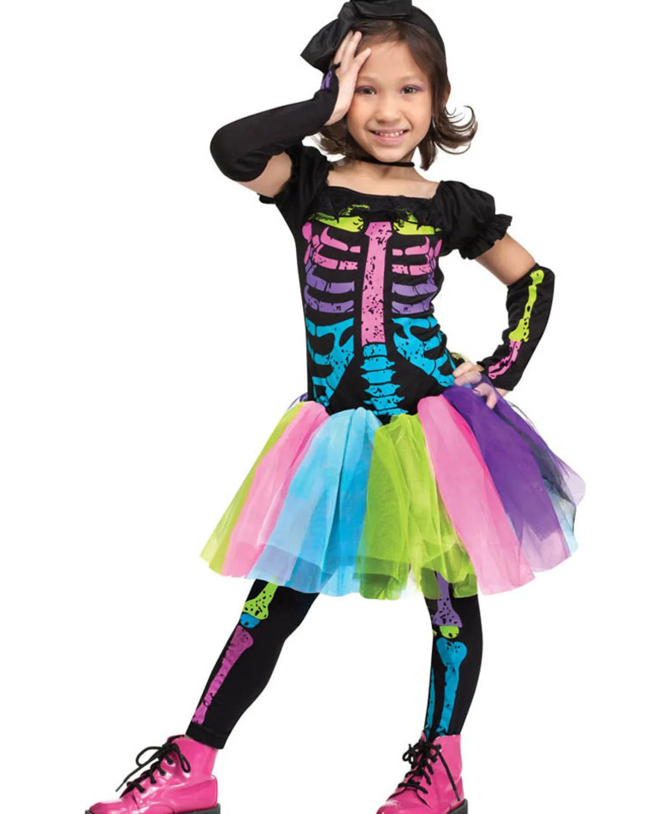 For A Bright And Colourful Skeleton Halloween Costume You Can’T Go Past The Funky Punk Skeleton Toddler And Girls Costume. Featuring A Dress With Printed Colourful Skeleton And Attached Rainbow Tutu, Sleevelets, And Footless Black Tights With Printed Skeleton Bones.