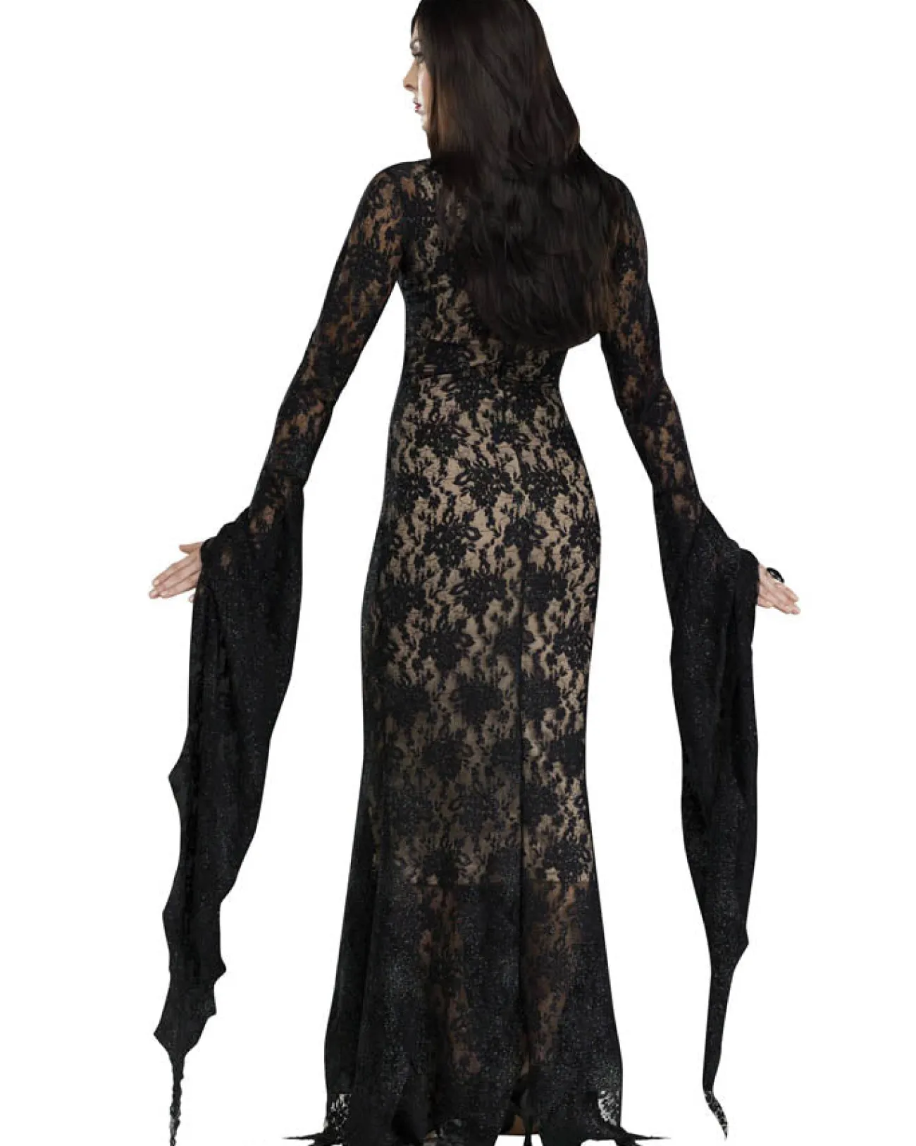 This Lace Morticia Womens Costume Is An Elegant Take On The Usual Black Dress. This Black Shimmering Lace Patterned Dress Has A Flesh Coloured Sheath Underneath, Long Floaty Sleeves And A Ragged Hemline. So This Season!