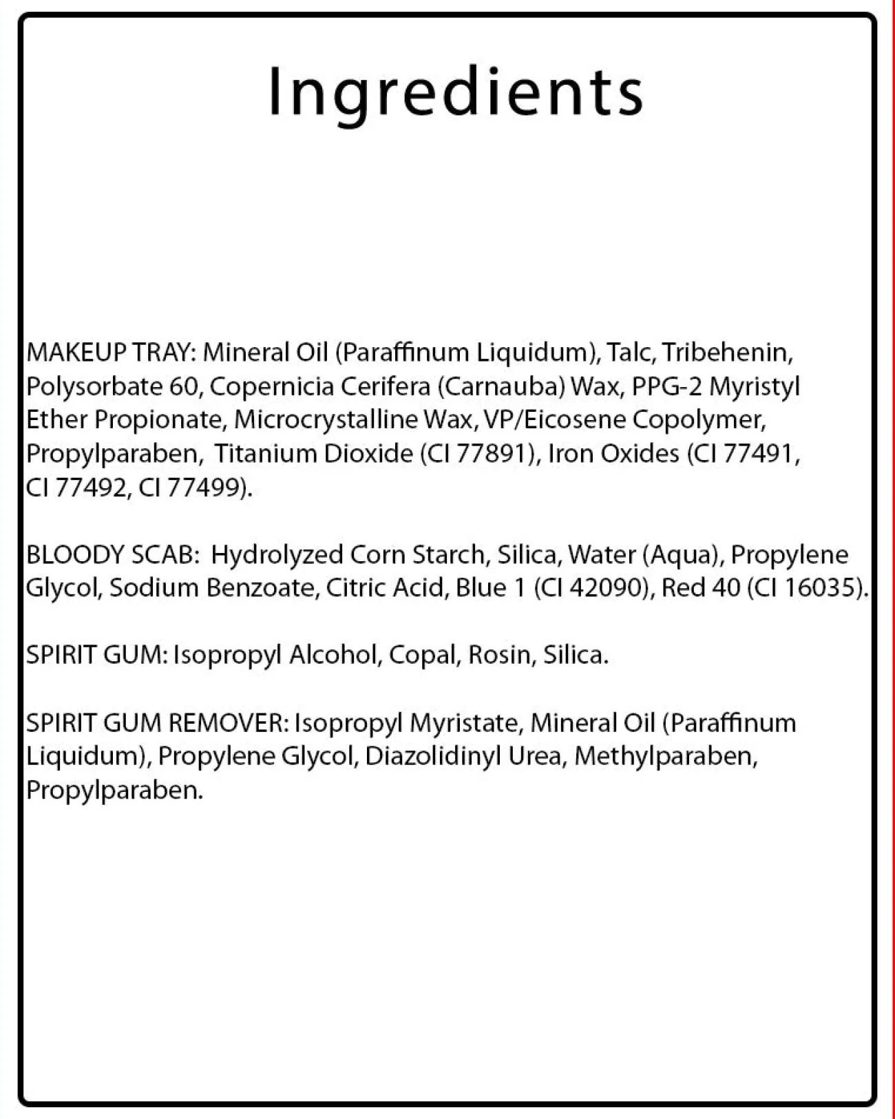 Ingredients: Makeup Tray: Mineral Oil (Paraffinum Liquidum), Talc, Tribehenin, Polysorbate 60, Copernicia Cerifera (Carnauba) Wax, Ppg-2 Myristyl Ether Propionate, Microcrystalline Wax, Vp/Eicosene Copolymer, Propylparaben, Titanium Dioxide (Ci 77891), Iron Oxides (Ci 77491, Ci 77492, Ci 77499). Bloody Scab: Hydrolyzed Corn Starch, Silica, Water (Aqua), Propylene Glycol, Sodium Benzoate, Citric Acid, Blue 1 (Ci 42090), Red 40 (Ci 16035). Spirit Gum: Isopropyl Alcohol, Copal, Rosin, Silica. Spirit Gum Remover: Isopropyl Myristate, Mineral Oil (Paraffinum Liquidum), Propylene Glycol, Diazolidinyl Urea, Methylparaben, Propylparaben.
