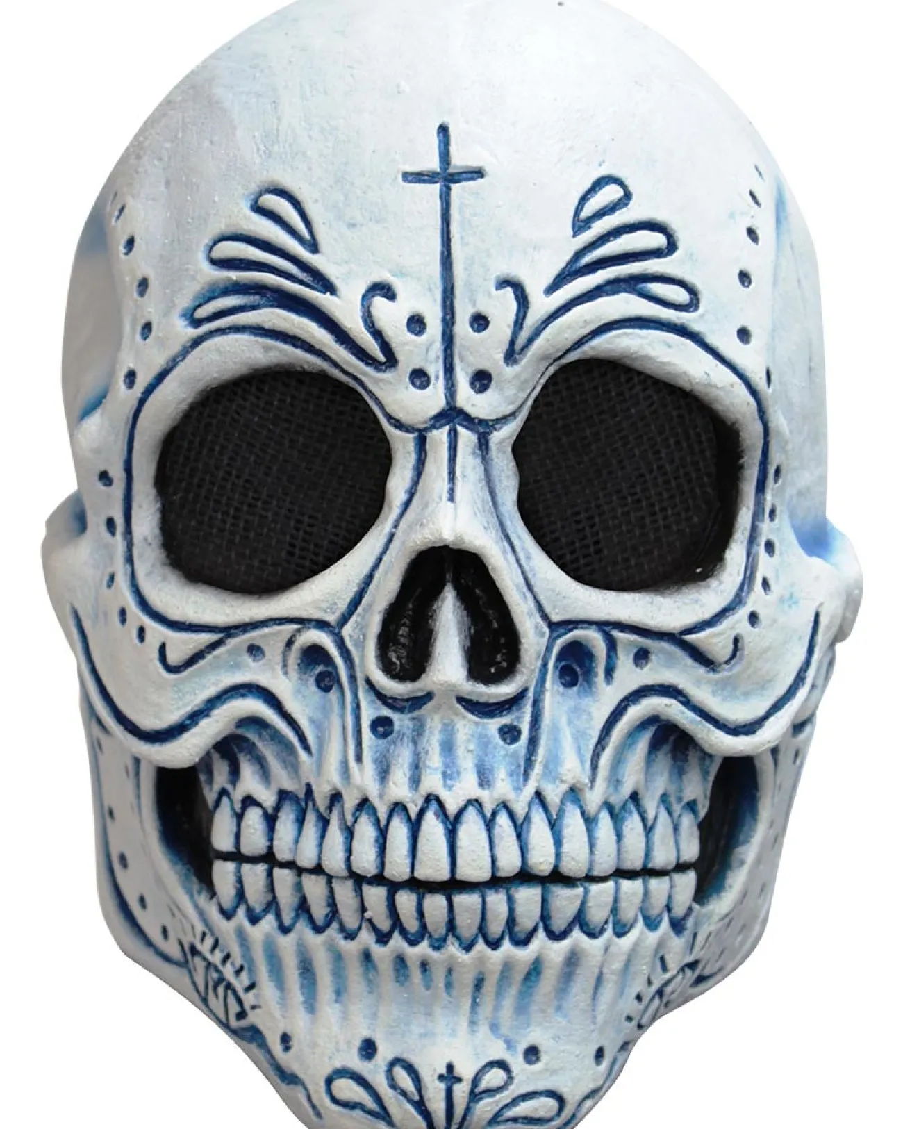 Scatter Marigold Petals For Loved Ones Wearing This Mexican Catrin Mask. A Great Mask To Wear For Halloween As Well, This Latex Mask Is In The Shape Of A White Skull And Is Painted Blue With Intricate Patterns, Designs And Shapes Around The Front. Along The Sides Is Blue Shading With Sections Of The Skull Painted Black For Where There Should Be Gaps. For You To Be Able To See, There Is Black Mesh Inside The Eye Sockets. To Complete The Look, Pair This Latex Mask With Our Range Of Day Of The Dead Accessories And Costumes.