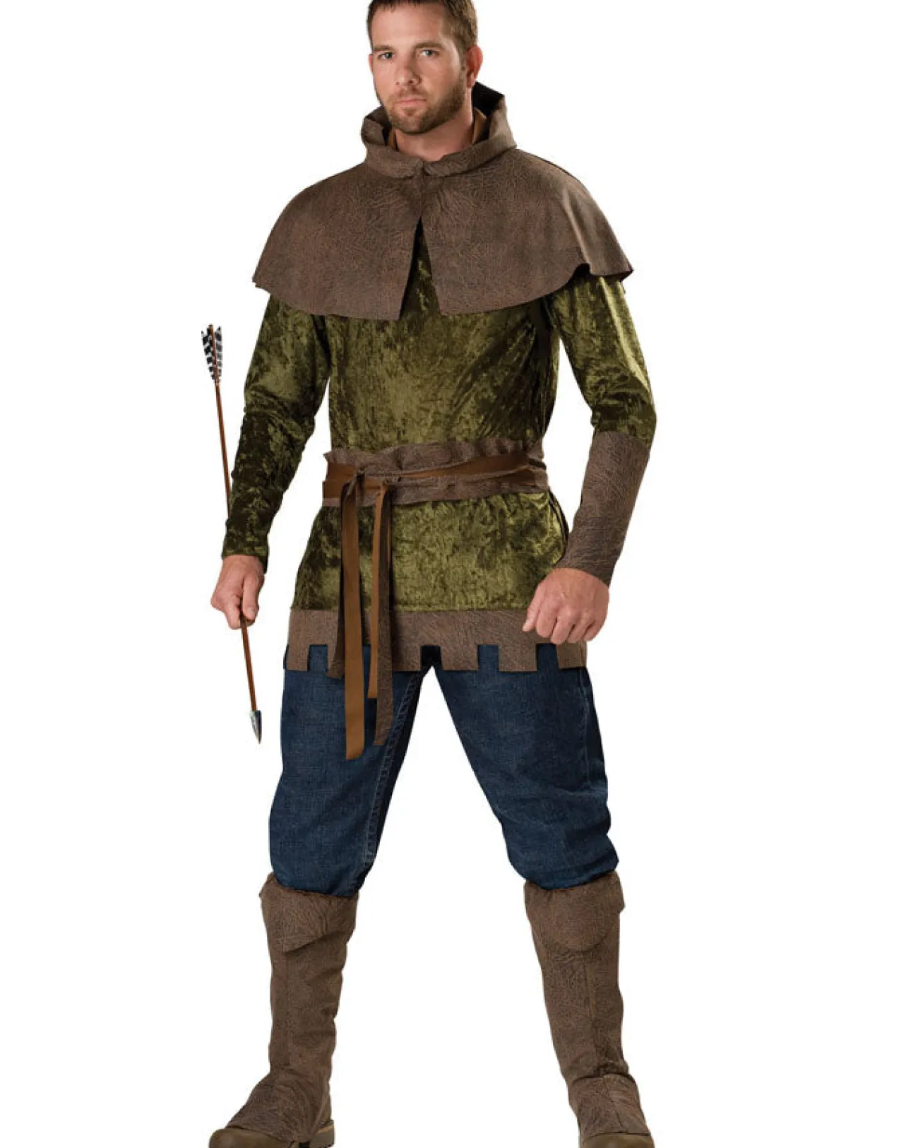 This Robin Hood Of Nottingham Mens Costume Is A Great Period Outfit. A Green Velour Tunic That Pulls Easily Over The Head, Faux-Leather Hood With Velcro Neck Closure, One Arm Gauntlet And Boot Covers. Just Add Boots, Your Own Pants And Bow And Arrow To Complete The Look. Perfect For Pillaging Loot From The Rich.