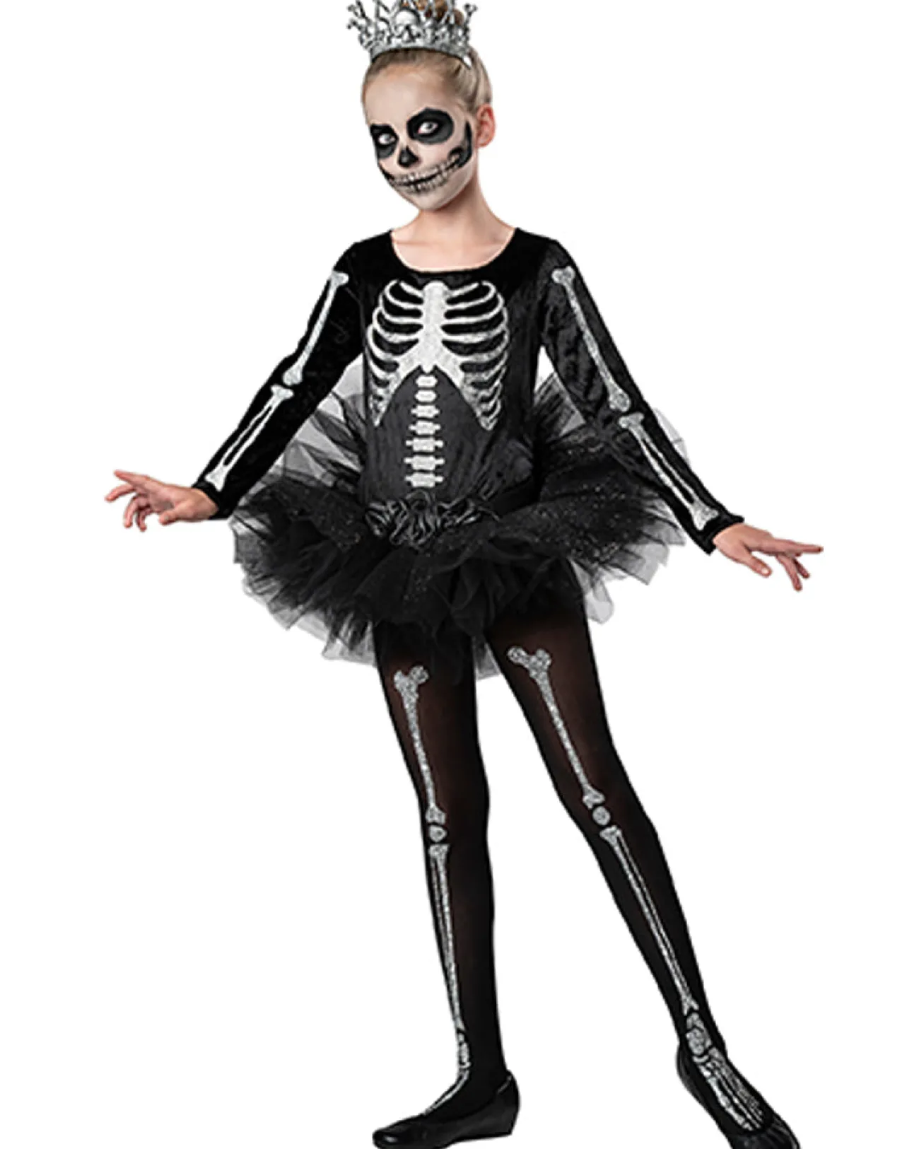 Dance ‘Til You’Re Dead In This Skeleton Ballerina Girls Costume! Perfect For That Budding Ballerina Who Works Herself To Death To Wear On Halloween! This Funky Costume Comes As A Black Long Sleeved Leotard With Printed White Skeleton Bone Detail, Matching Black Stockings With Leg Bone Detail At The Front, A Black Tutu And Also A Skeleton Bone Crown To Top Off The Costume! To Copmlete The Costume, Simply Grab Some Black And White Makeup And Create Your Own Skull Face!