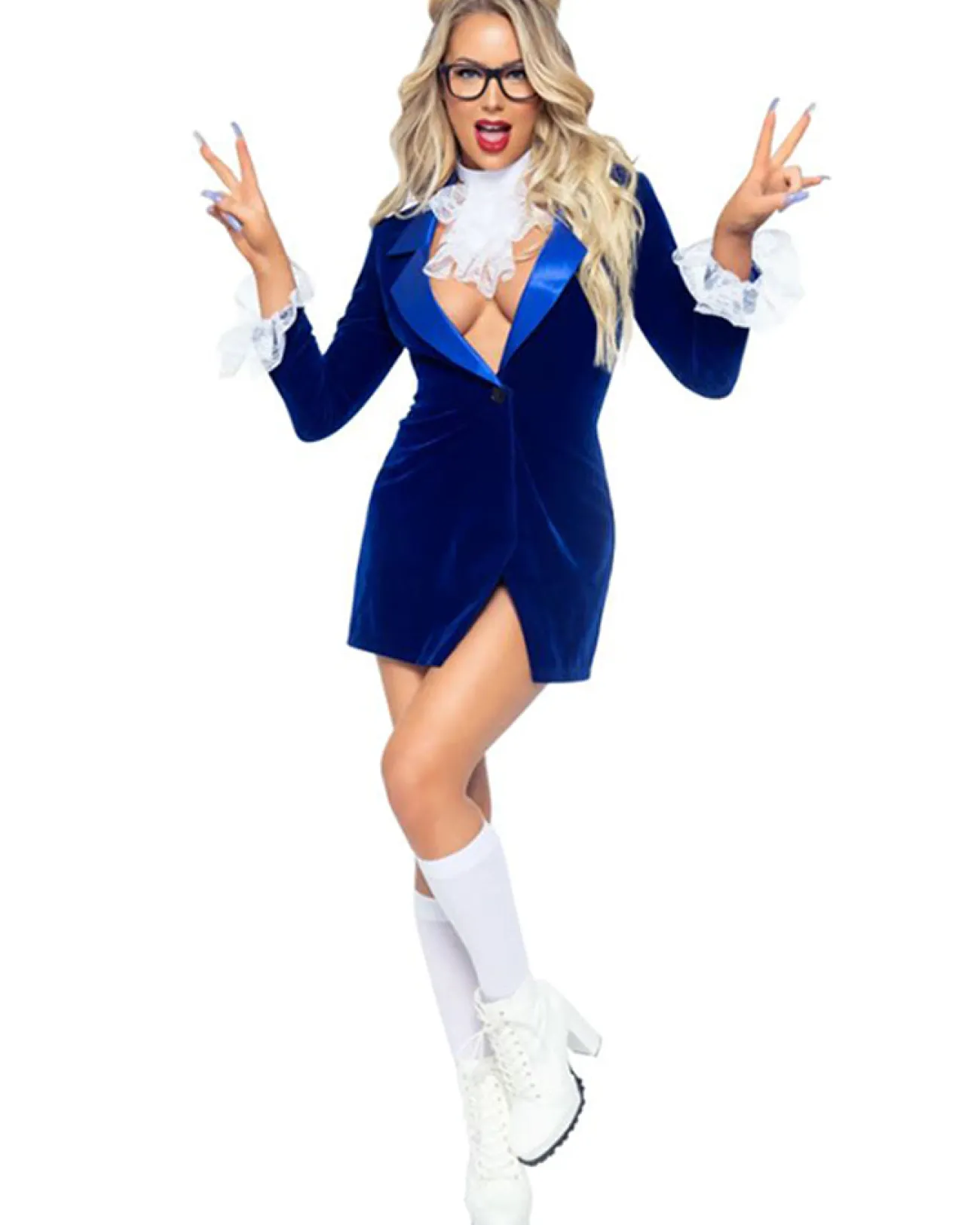 Join The Fembots On A Groovy Adventure Wearing Our Sexy 60S Swinger Womens Costume. Featuring A Blue Velvet Suit Dress, Styled With A Plunging V Neckline, Satin Lapels, A Pair Of White Lace Cuffs And A Split Hem. The Costume Comes Complete With A White Lace Jabot That Wraps Around Your Neck And A Pair Of Glasses. Great As A Group Costume Idea For Your Next Halloween.