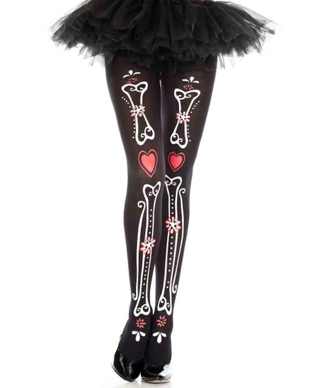 Music Legs Bone And Heart Print Pantyhose> Halloween Accessories