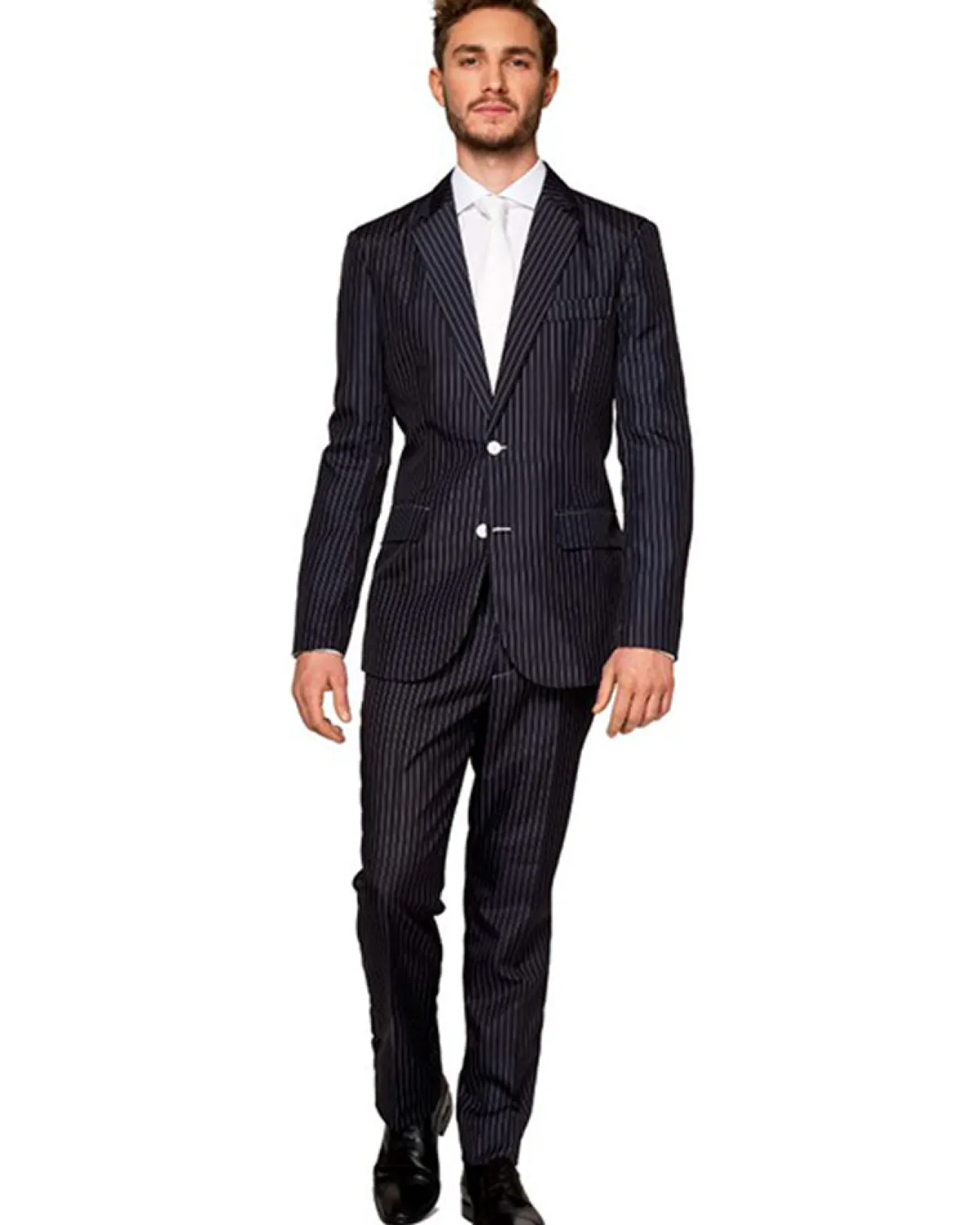 Become A Mob Boss When You’Re Wearing Our Gangster Mens Suitmeister. Featuring A Black Pinstripe Suitmeister That Includes A Matching Jacket, Trousers And Solid White Tie! The Suitmeister Has Fake Pockets On The Outside Of The Jacket And One Pocket In The Inside Of The Jacket, Plus The Trousers Have Two Front Pockets And One In The Back. Both The Trousers And Jacket Can Be Extended However As The Waist Is Elastic The Elastic Adjusts To The Wearer’s Size, For An Easy Fit! A Fedora, Gun Holsters And Black Suspenders Will Work Very Well With This Suitmeister!