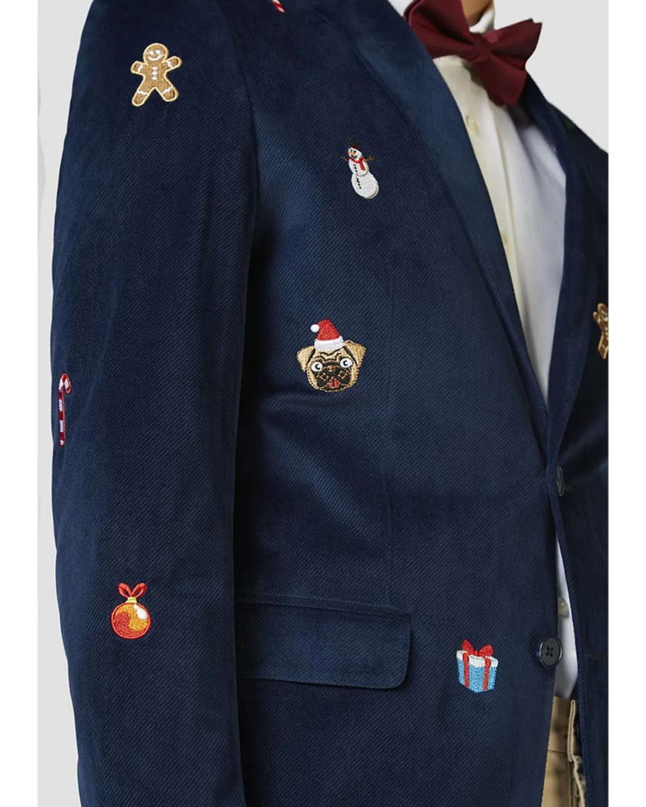 For A Stylish And Well-Defined Christmas Outfit Check Out Our Opposuit Christmas Icons Navy Deluxe Mens Blazer. Featuring A Navy Blue Blazer Made With High-Quality Polyester Material, Embroidered With Christmas Icons. The Slim-Fit Blazer Is Fully Lined And Features A Single Vented Back, 2 Front Buttons, 4 Inside Pockets, A Chest Pocket, 2 Front Flap Pockets, Notched Lapels, And Padded Shoulders. If You’Re Unsure About Sizes We Recommend Picking The Larger Size Of The Two Suits As They Come In A Slim Fit. All Opposuit Pants And Jackets Are Lined With A Small Amount Of Additional Fabric So That If Desired, They May Be Tailored To Your Exact Length And Fit By An Alterations Business Or Tailor. The Waistband Includes Elastic To Allow For Automatic Adjusting To Suit The Wearer.