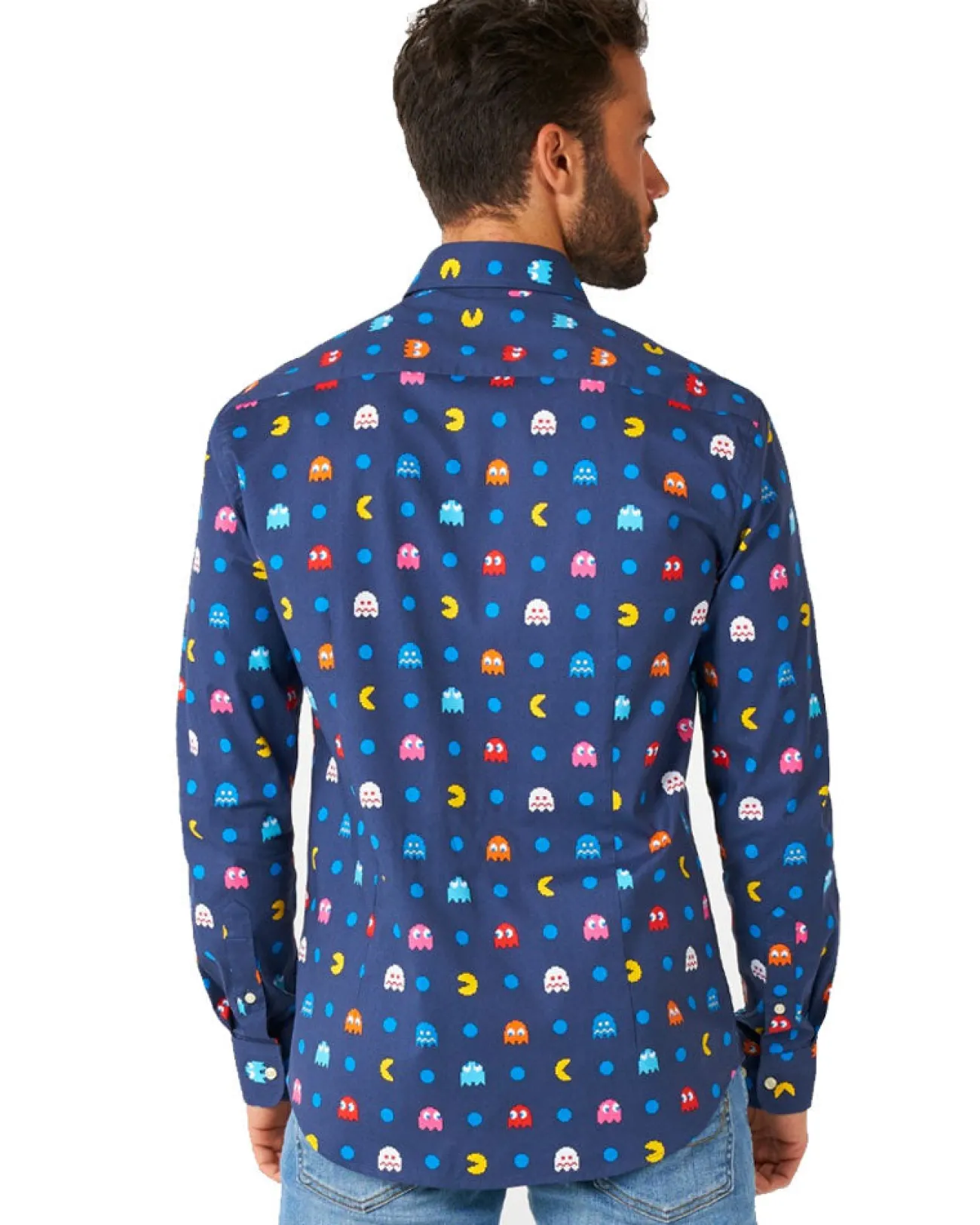 Pack Up Every Other Shirt In The Wardrobe, You’Ve Got This Winning Opposuit Pixel Pac Man Mens Shirt Now. This Long Sleeve Shirt Is Dark Blue And Printed With A Repeating Pattern Of Pac-Man Eating His Dots And Being Surrounded By His Enemies: Inky, Binky, Pinky And Clyde. The Shirt Is Also Designed With A Modern Tailored Fit With A Button Up Front And Buttoned Cuffs. Perfect For 80S Parties Or To Add Some Retro Vibes To Your Everyday Look.