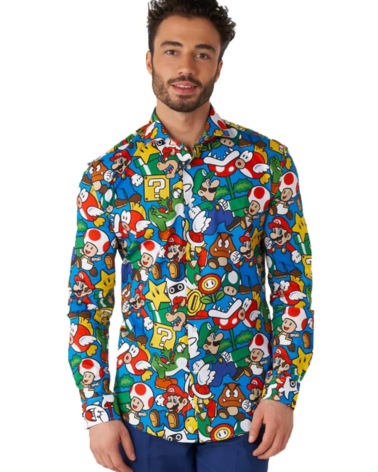 Rule The Mushroom Kingdom Wearing This Stylish Opposuit Super Mario Mens Shirt. This Long Sleeve Shirt Comes In Blue And Features Bright Printed Images Of Characters And Tokens From The Super Mario Games. Some Of The Included Images Are; Mario, Luigi, Bowser, Toad, The Ghost, Flowers, Blooper And More. Wear This Shirt Under Your Own Suit Jacket And Pants Or Check Out Our Range Of Opposuits To Choose From.