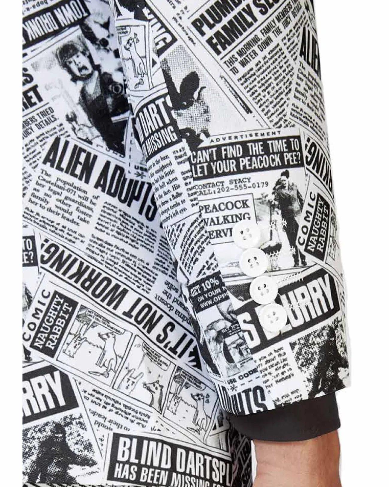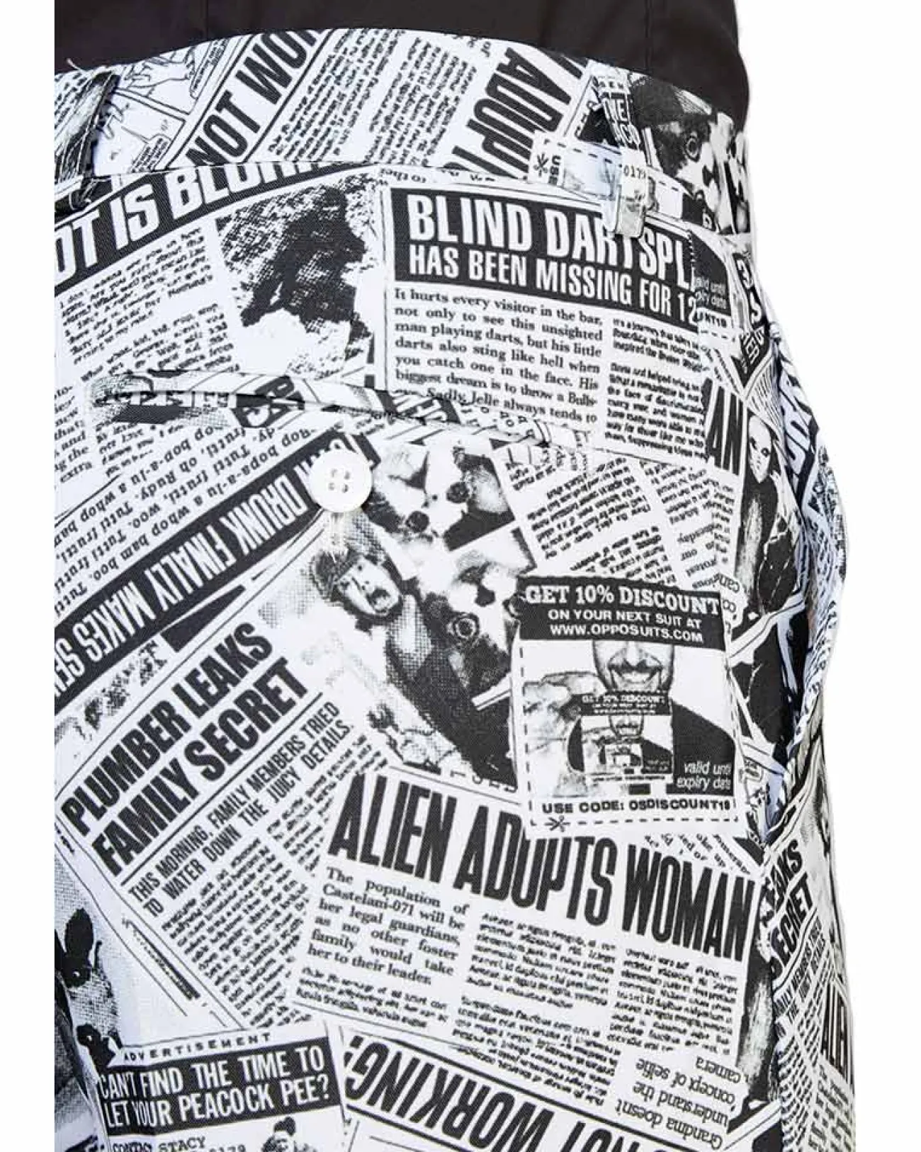 Look Your Best In Our Opposuit Textile Telegraph Premium Mens Suit. Made From A High Quality Suit Material The Opposuit Features A Fully Lined Jacket With Notch Lapels, Two Front Flap Pockets And Four Inside Pockets, What’s More, The Matching Trousers Including 2 Side Pockets And 2 Buttoned Back Pockets! Designed With A Collage Of Black-White Hilarious Newspaper Headlines Including “Alien Adopts Women” And “Blind Darts Player Has Been Missing For 12 Years!”. If You’Re Unsure About Sizes We Recommend Picking The Larger Size Of The Two Suits As They Come In A Slim Fit. All Opposuit Pants And Jackets Are Lined With A Small Amount Of Additional Fabric So That If Desired, They May Be Tailored To Your Exact Length And Fit By An Alterations Business Or Tailor. Also, The Waistband Of Trousers Can Be Adjusted 2 Sizes Larger Or Smaller Than The Original Size.