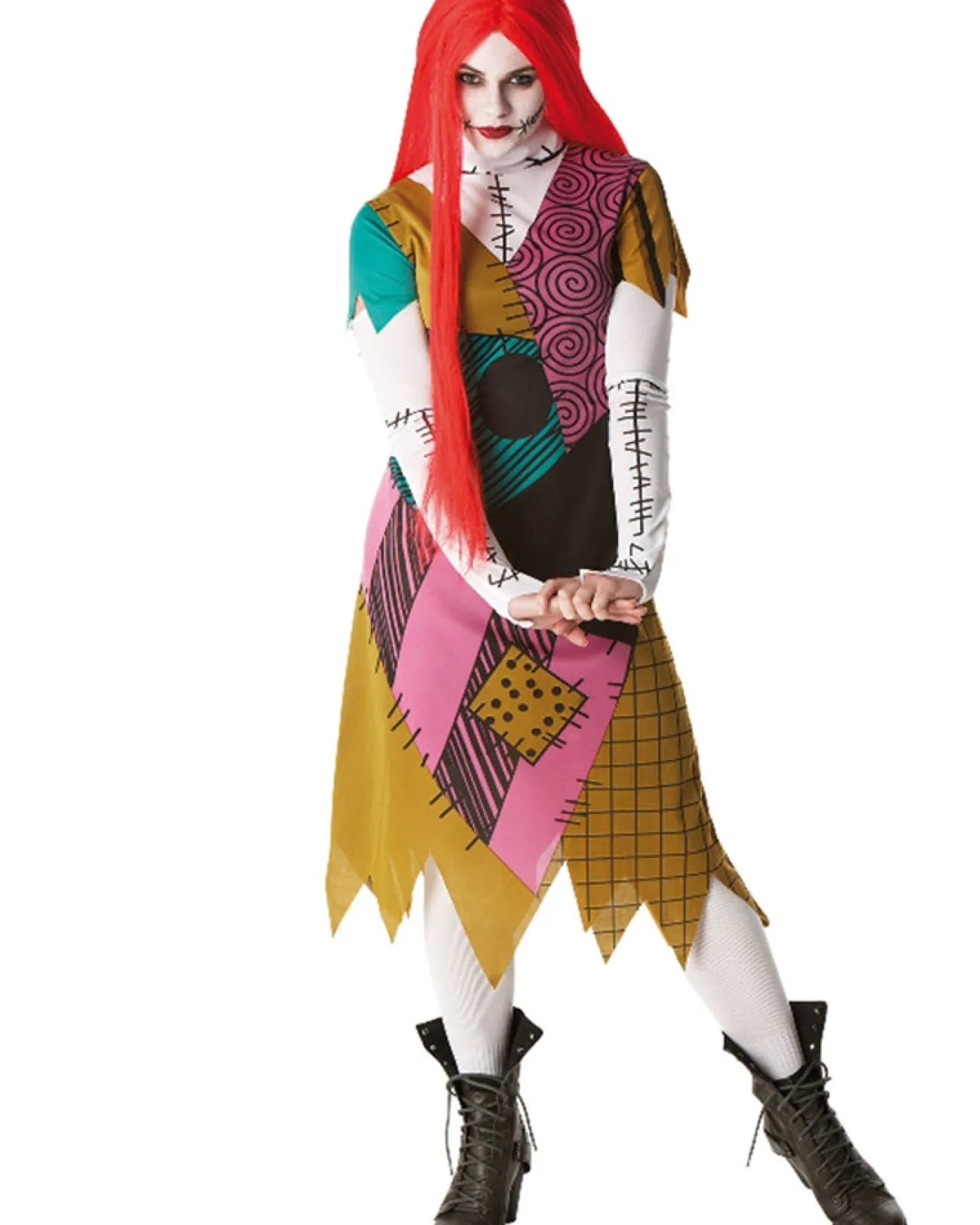 Find Yourself Walking Through The Town’s Cemetery, Singing About Your Beloved Friend When You Dress In This Disney Nightmare Before Christmas Sally Womens Costume, Days Before Halloween Night. This Movie Style Costume Includes A Printed Ragged Dress In Colours Teal, Yellow, Pink And Black Printed To Look Like Just Like Sally’s In The Film Nightmare Before Christmas And A Pair Of White Glovelets With Black Stitching Printed Along The Arms And Finally A Long Vibrant Red Wig. This Rag Doll Stars In The Classic Film By Tim Burton About The Little Town Called Halloweentown Where All Spooky Characters Live, From Vampires, Scary Clowns, Skeletons And Other Individuals You Will Only Meet During Halloween. Sally Was Brought To Life By Her Creator And The Only Scientist Of The Town, Dr Finkelstein, Who After Creating Sally Tries To Confine Her To His Lab. Sally Soon Falls In Love With The Towns Pumpkin King, Jack Skellington And Together Become The Perfect Couple And Live Happily Together.