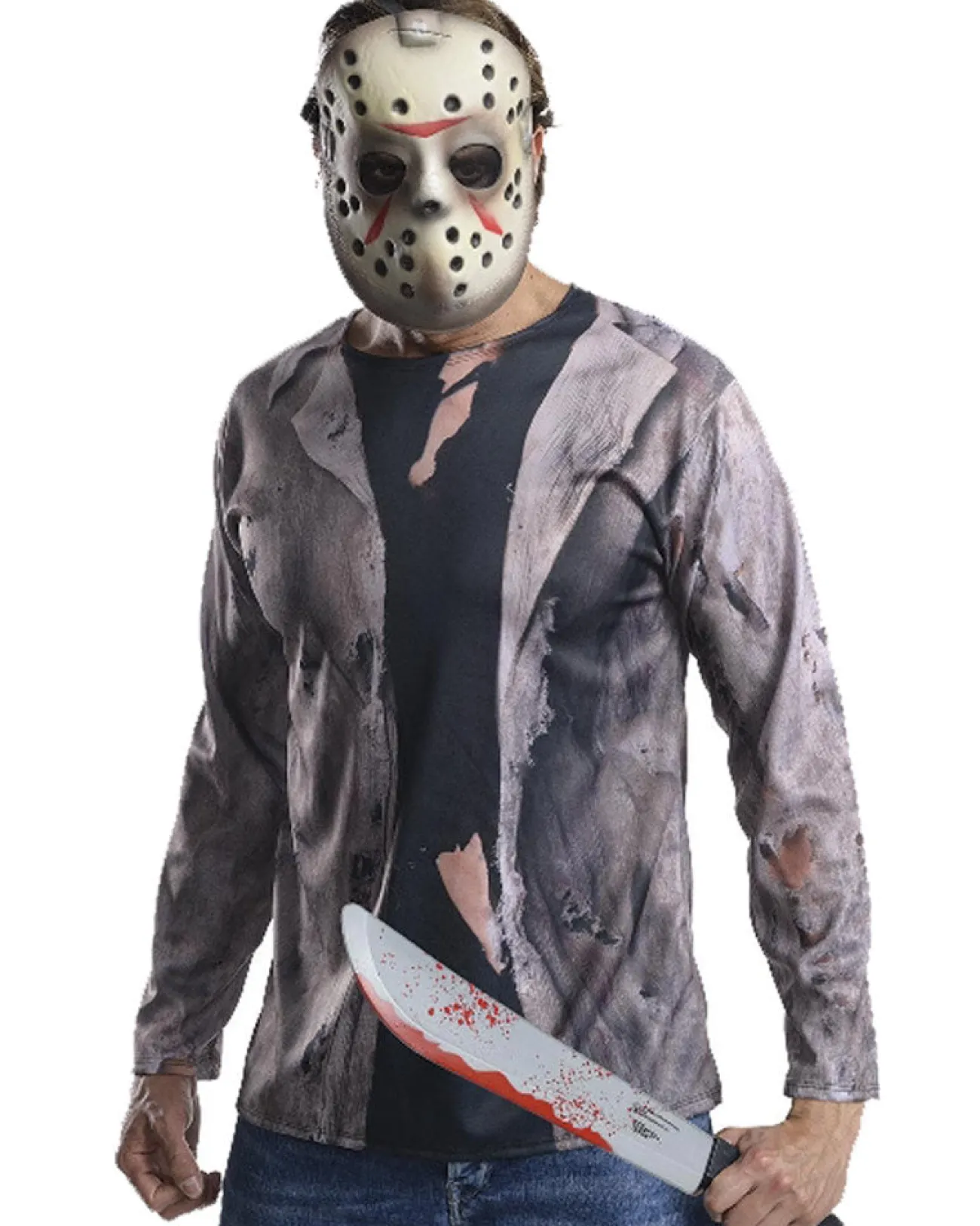 Don’T Leave Any Survivors Behind And Become An Iconic 80S Character, With This Friday The 13Th Jason Deluxe Mens Shirt Mask And Machete Kit. A True Pop Culture Icon, This Jason Costume Kit Will Have Your Friends Screaming. Kit Contains A Digitally Printed Shirt Which Depicts A Ripped Black Top Underneath A Grungy Looking Beige Jacket Over The Top, A Moulded Hockey Mask Based Off The One Jason Wears In The Films Which Features An Elastic Strap Around The Back. Complete The Characters Look With The Included Plastic Machete Prop, Which Is Painted With Splatters Of Red Blood Around The Blade. Simply Slip On Your Own Pair Of Pants And You’Re Ready To Stalk The Night, Looking For Young Victims Who Are Out Terrorising Your Camp Crystal Lake.