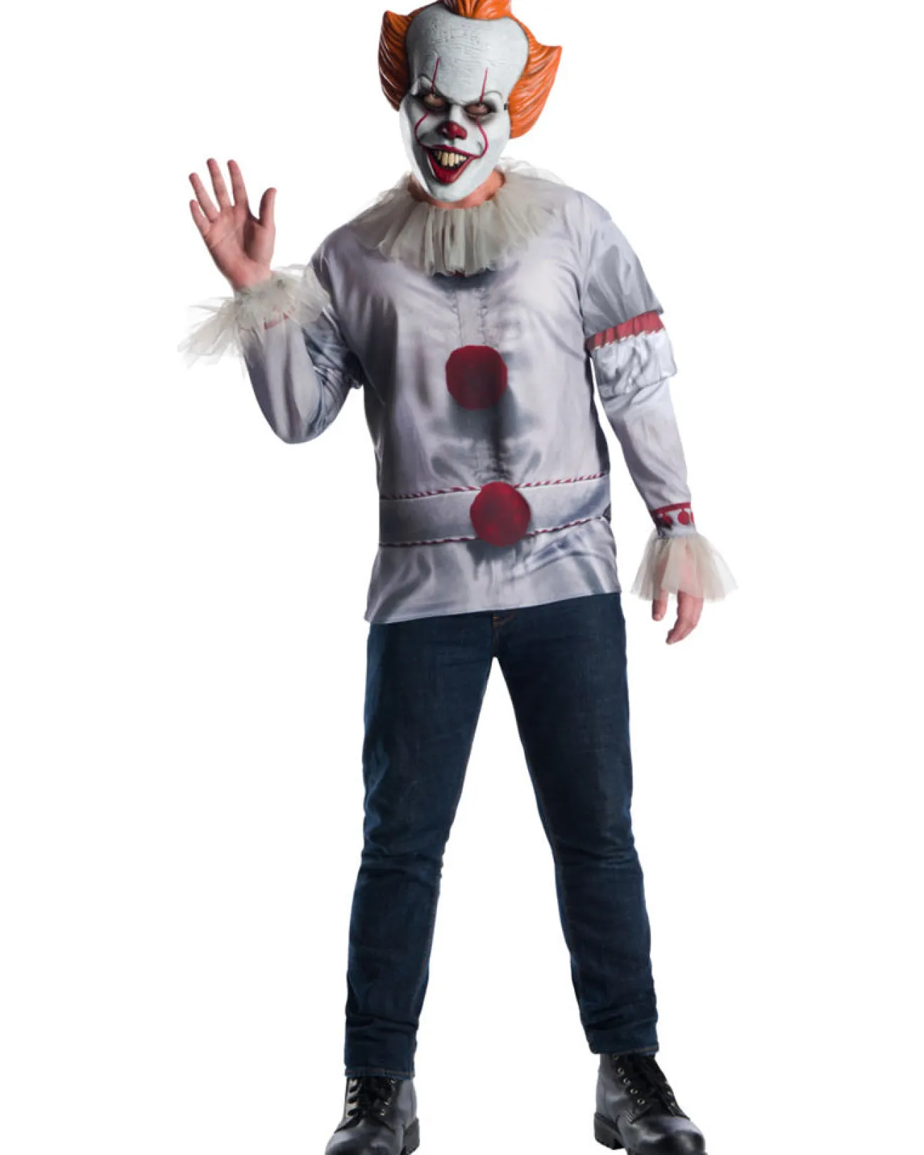 Dole Out Some Fear This Halloween In Our Pennywise Top And Mask Mens Costume. A Long Sleeve Character Inspired Shirt This Is Not One For Clowning Around. The Shirt Has A Been Rolled In And Pleated On The Arms To Give A Tiered Fabric Effect, As If You Were Wearing Multiple Layers Of Clothing. The Wrists And Neck Have Been Trimmed With The Classic Mesh Fabric Clown Ruff Style. The Transfer Print Of The Shirt Is As Close To Pennywise As Most People Dare To Be, With His Chilling White Clothing Spattered With Red Baubles. The Provided Mask Is A Nightmarish Effigy To The True Master Of Fear, Contorted Into A Twisted Grin This Mask Is Hard To Put On While Facing The Mirror. Combine This Set With Our Huge Range Of Costumes And Accessories To Create Your Perfect Version Of Pennywise The Dancing Clown.