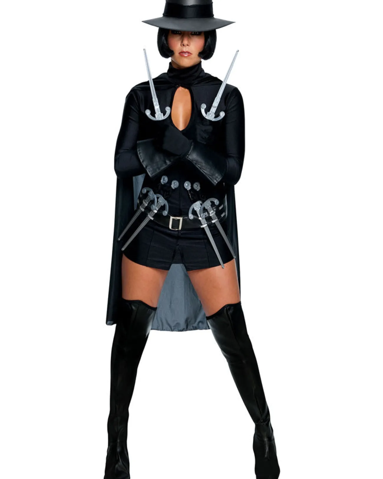 Become A Female Version Of V, The Bold, Charismatic Freedom Fighter Attempting To Ignite A Revolution Against The Brutal Fascist Regime. This V For Vendetta Womens Costume Includes A Sexy Black Dress With Attached Cape, Hat, Gloves And Boot Covers With A Belt Containing 6 Daggers, Just Like In The Movie.