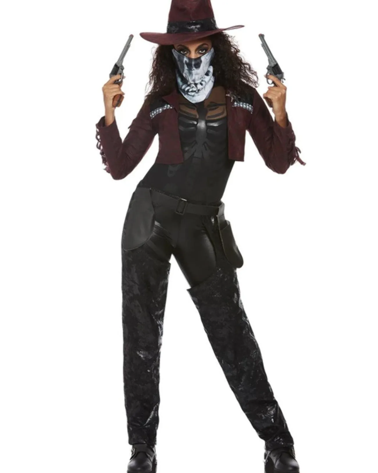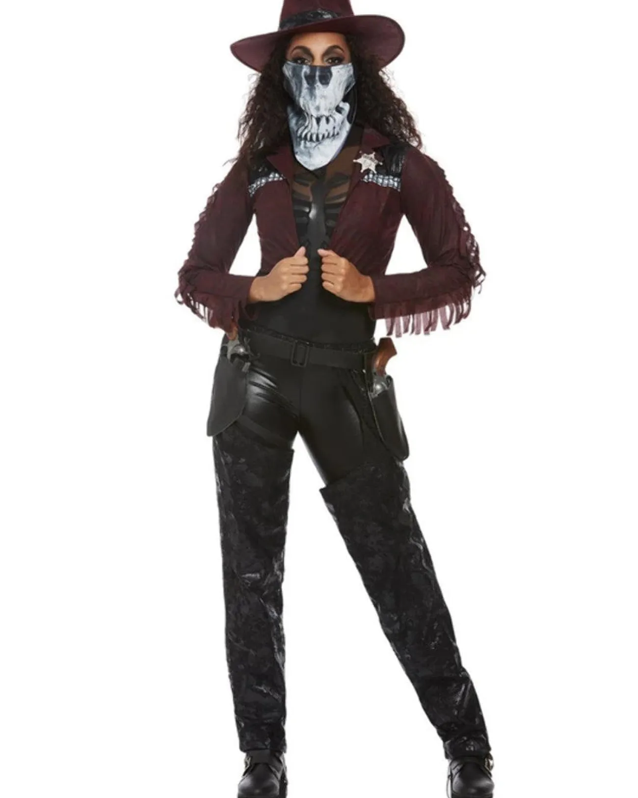 Wreak Havoc Under A Western Sky In This Fabulous Deluxe Dark Spirit Western Cowgirl Womens Costume. The Costume Comes With A Cropped Burgundy Jacket With Fringe Detail At The Sleeves, A Matching Burgundy Cowgirl Hat, Black Chaps, A Gun Holster Belt And A Ghostly Bandana Mask That Sits Around The Nose And Mouth. Add Your Own Ghostly Makeup, Gun Props, Top, Pants And Cowgirl Boots To Complete The Look Your Way. Perfect For Halloween, Or Any Western Party Or Cowboy And Cowgirl Themed Parties.