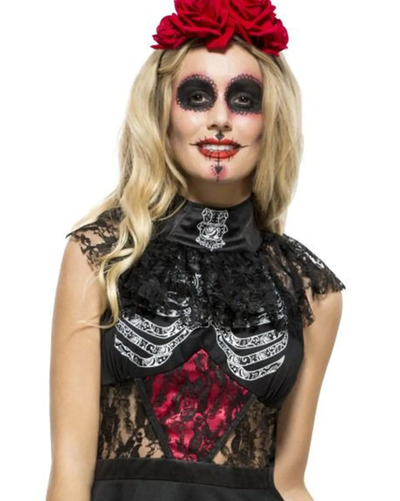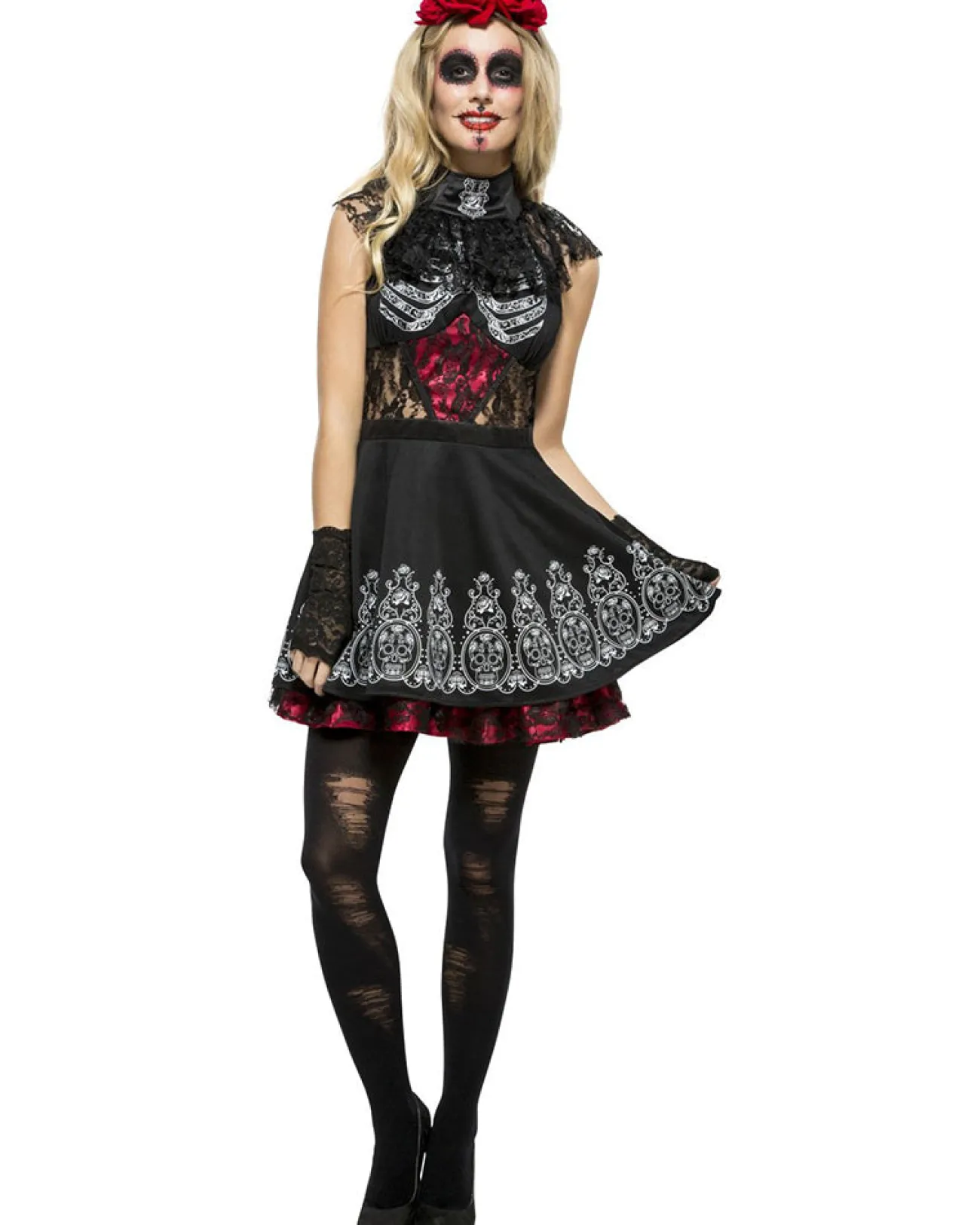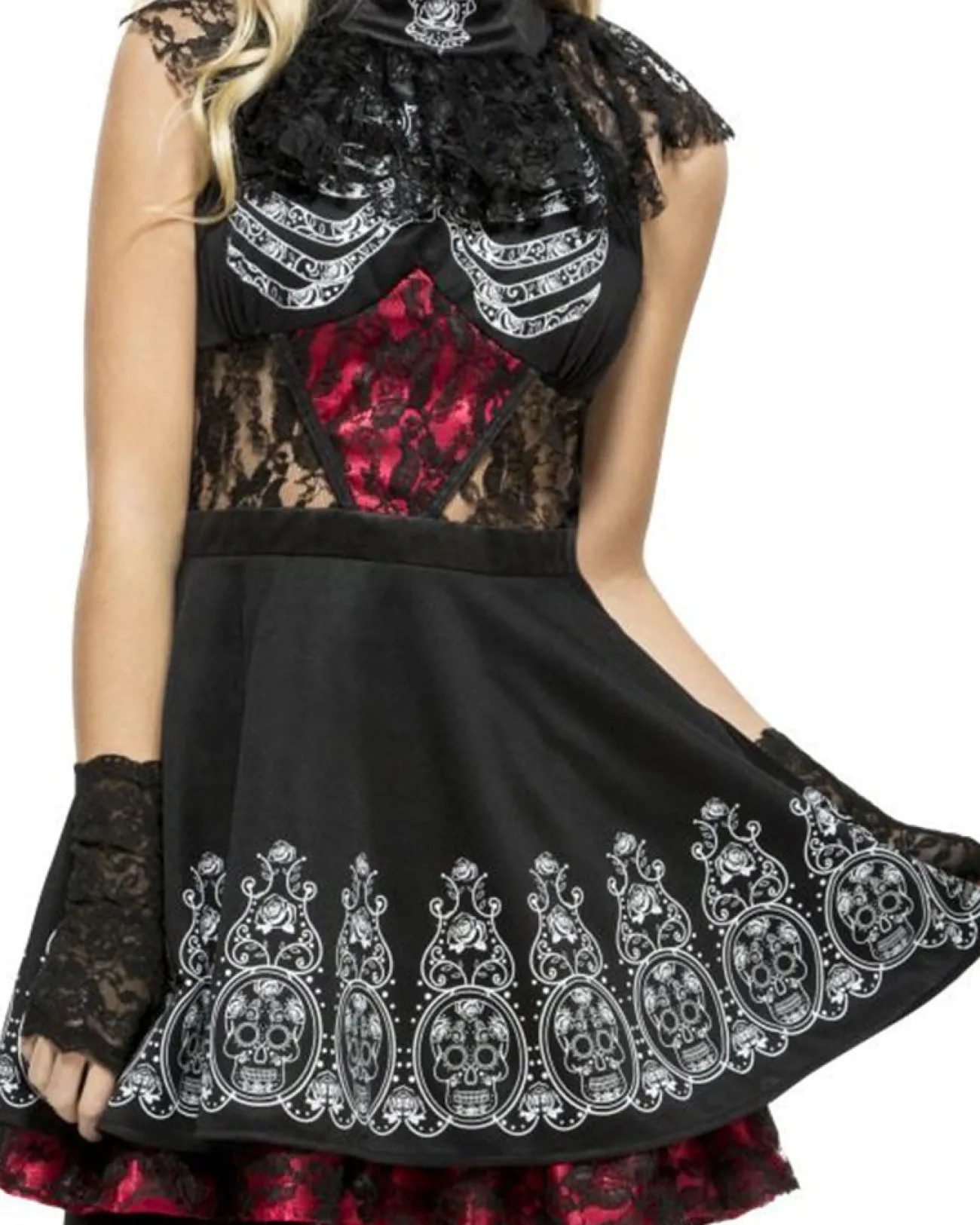 Greetings From The Land Of The Dead, Let’s Celebrate The Life Of Loved Ones As You Dance And Sing In This Fever Day Of The Dead Womens Costume On Halloween Night. This Festive Costume Comes Complete With A Dress Which Features, A Black Bodice With A Printed White Ribcage, Black Lace Short Sleeves And Lace Panels Along Mid Section, A Black Skirt With White Decorative Skull Design Along The Bottom, Attached To The Skirt Is A Red Underskirt With Black Lace And Finish The Look A Headband With Attached Large Red Roses. For A Complete Dia De Los Muertos Look, Pair This Dress Up With Some Sugar Skull Makeup, A Pair Of Heels And Scatter Some Marigold Petals Around You As You Walk, Giving A Path To Those In Spirit.