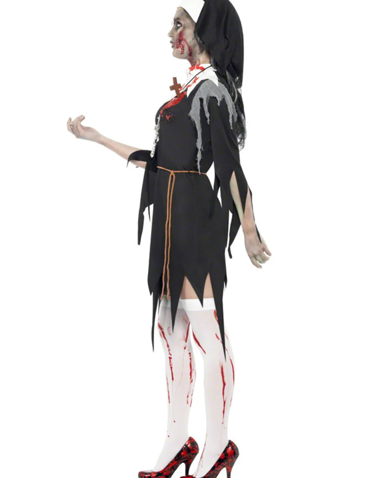 Scare The Life Out Of Everyone This Halloween When You Show Up Wearing This Zombie Bloody Mary Womens Plus Size Costume. The Costume Features A Black Dress With Jagged Edges And White Blood Stained Collar As Well As A Rope Belt And Headpiece. There Is Also A Latex Wound On The Dress To Give It That Extra Bit Of Gore. Pray To The Heavens That This Nightmarish Costume Doesn’T Give You Nightmares.